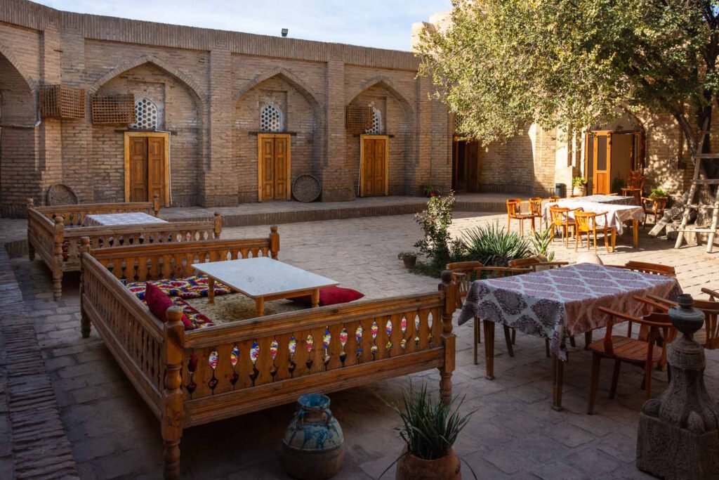 Those inside the  Ichon Qalʼа offer  atmosphere and short distances to tourist sites.  I stayed at the Silk Road Caravan Sarai, a beautiful converted caravansarai, with its own mosque and minaret, no less, just outside the walls of the Ichon Q’ala. I recommend it for its beautiful reconstruction, peaceful courtyard and well appointed comfortable rooms. Also, the price was a real steal for the atmosphere and level of comfort. All rooms are on the ground floor but aren’t entirely barrier free due to the narrow doors and bathrooms.