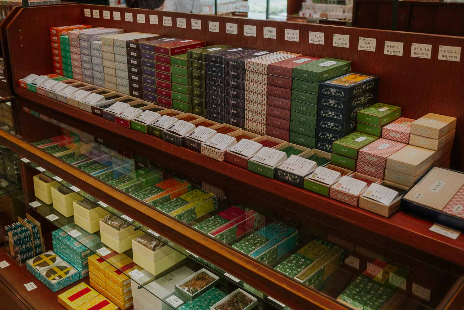 Kyukyodo has an overwhelming array of Japanese incense for the house and for religious use. From interior lines to classic agarwood incense, you can buy every kind of incense here. What’s really nice is that, like in many incense outlets, a display box is usually open for you to smell the incense to get an idea of the scents, but they will also offer to burn a piece so you know what it smells like when lit.
