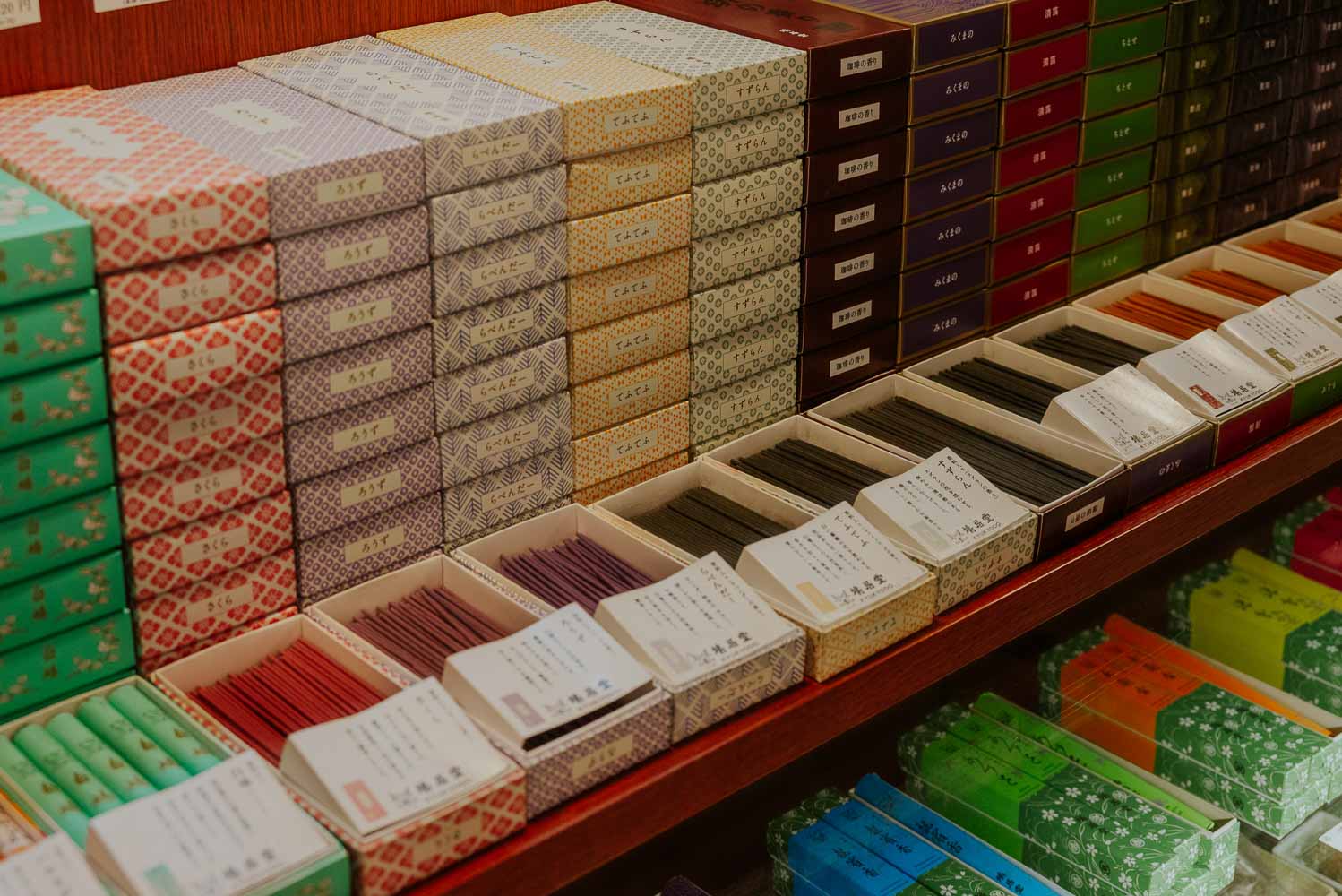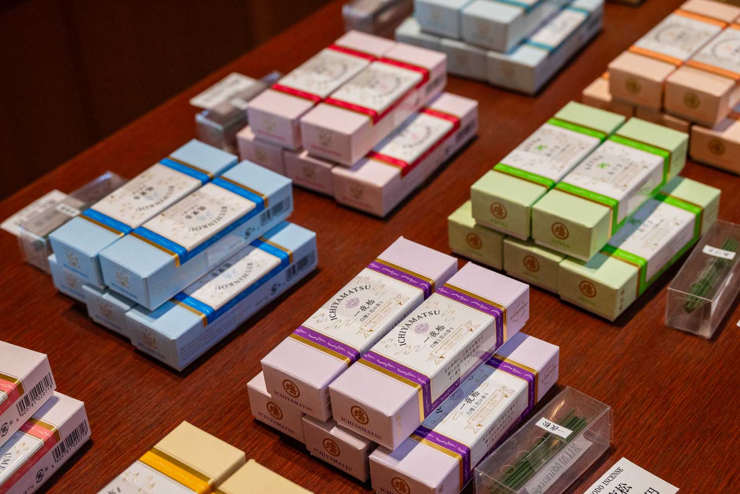 On the photo above is their daily “Western style” incense , a box of which can be had starting at 900JPY. Kyukyodo uses both natural and synthetic fragrance for their incense sticks. The packages of green sticks below contain their more “premium” incense blends, which are sold as longer sticks in smaller quantities.