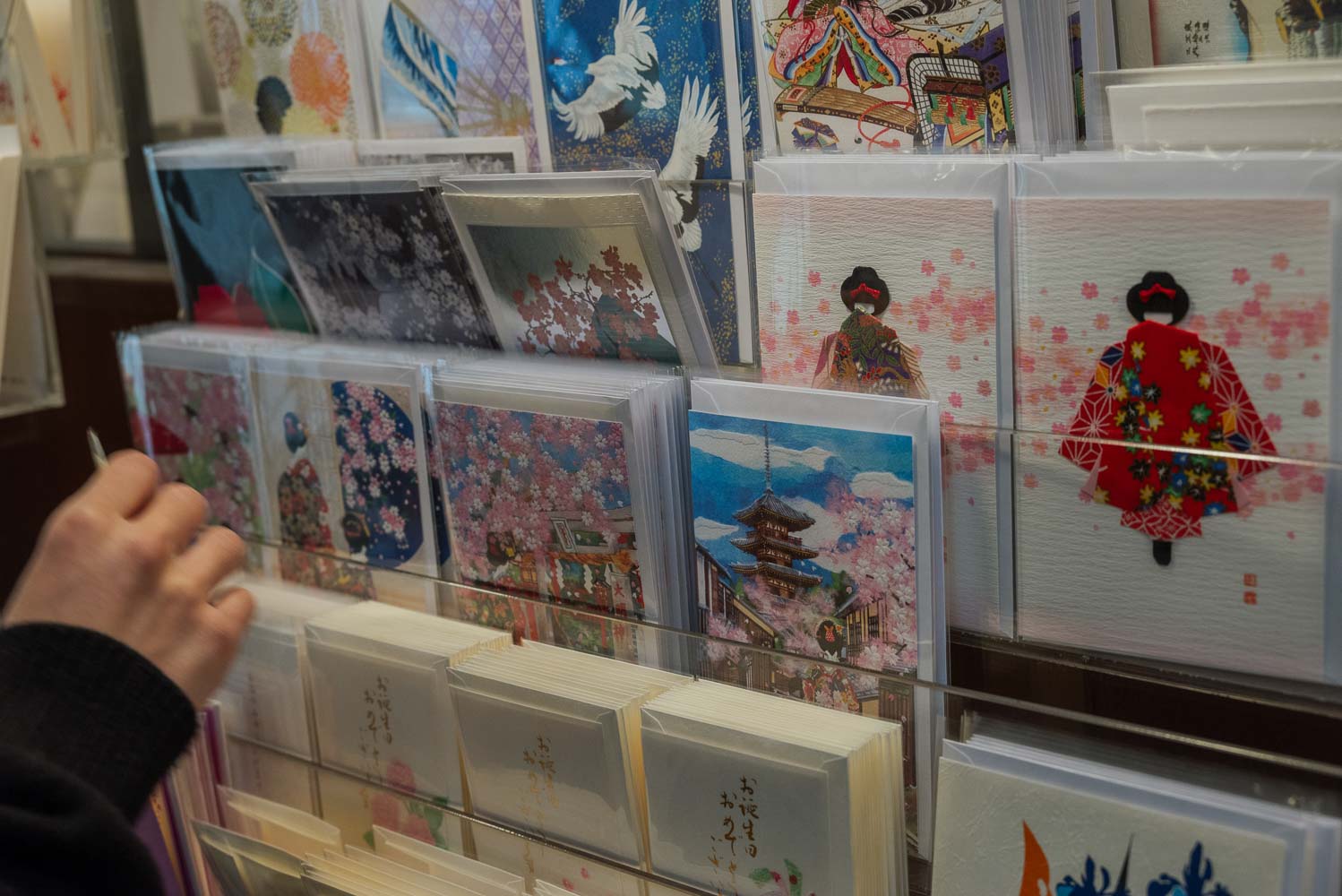 • Yes! Cards are not that easy to come by in Kyoto. I think I saw some at Kinkaku-ji but nowhere else. These were super nice cards at Kyukyodo, and the shop is very central! As for stamps… usually you have to go to the post office, but very nice service, stamps to Europe were really cheap